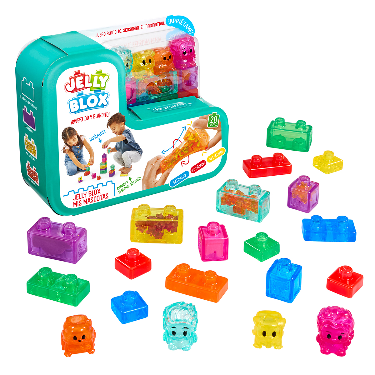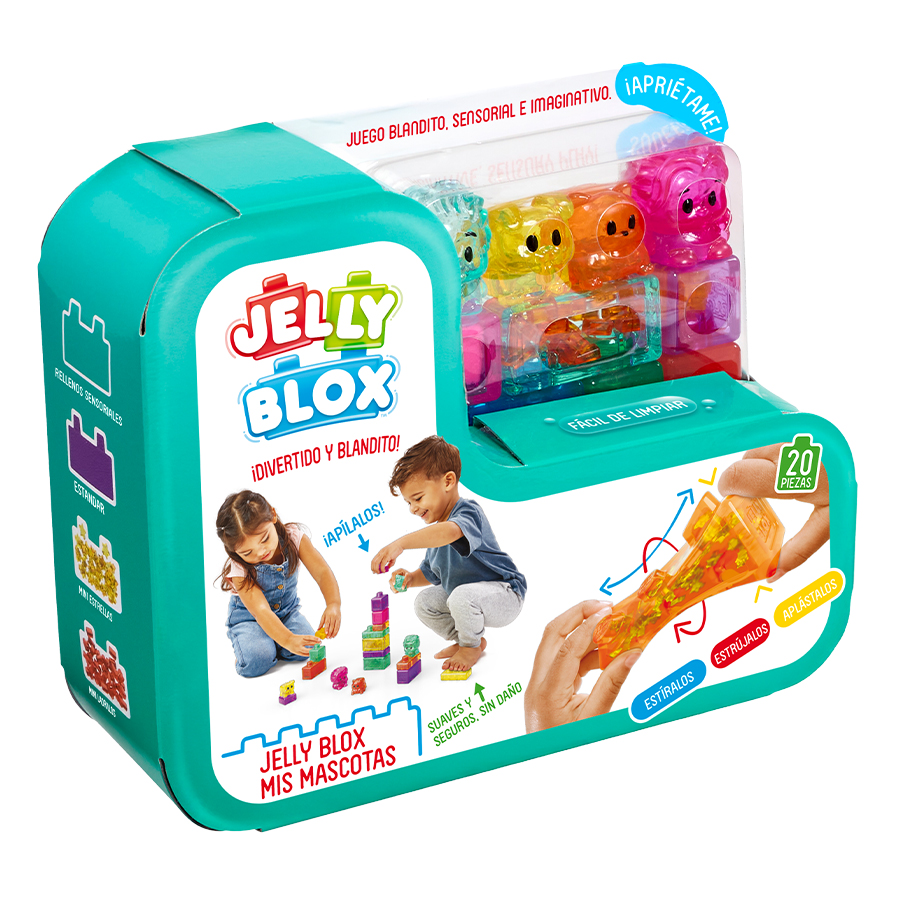 ¡Diversión sensorial con tus mascotas favoritas! Con Jelly Blox Mis mascotas, los peques podrán construir y jugar con 20 piezas blandas y coloridas llenas de texturas y sorpresas sensoriales, incluyendo 2 animales y 2 personajes. Los niños pueden inventar su propio mundo de juego alrededor de sus compañeros favoritos mientras desarrollan la creatividad y la imaginación. ¡Aprieta, construye y diviértete con tus Jelly Blox favoritos!