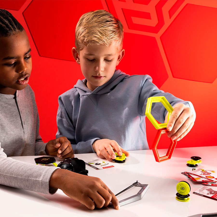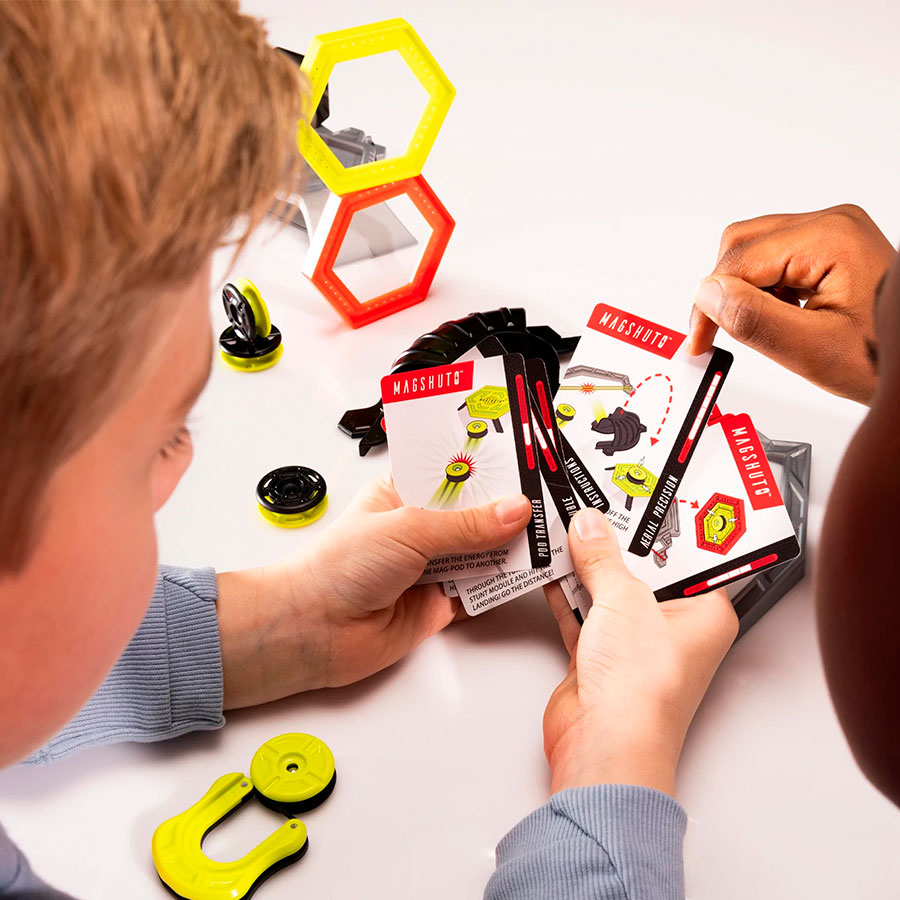 1 lanzador, 1 Mag Module, 6 Mag Pods, 1 rampa, 1 túnel de acrobacias, 2 aros de acrobacias, 20 cartas de desafío.