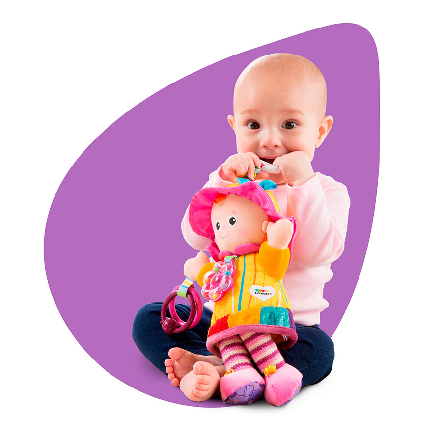 La primera muñeca del bebe tiene un collar de cascabel, anillos rugosos y sonidos interesantes y texturas.