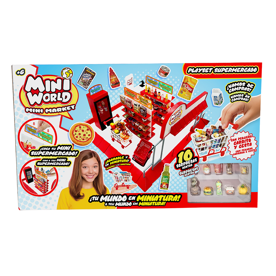 ¡Vive la experiencia de tu propio súper en versión mini! El Playset Supermercado incluye 10 mini coleccionables, además de una cesta y un carrito de la compra para que puedas jugar, organizar y completar tu colección. ¡Abre, descubre y diviértete con el universo Mini World, donde cada detalle cuenta!
