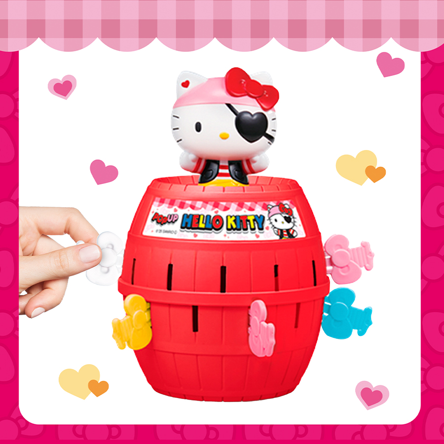 Coloca a Hello Kitty dentro del barril y ve introduciendo una a una las 24 varillas… ¡pero cuidado! En cualquier momento, ¡puede saltar por los aires! Un juego clásico de suspense y risas con el encanto inconfundible de Hello Kitty.